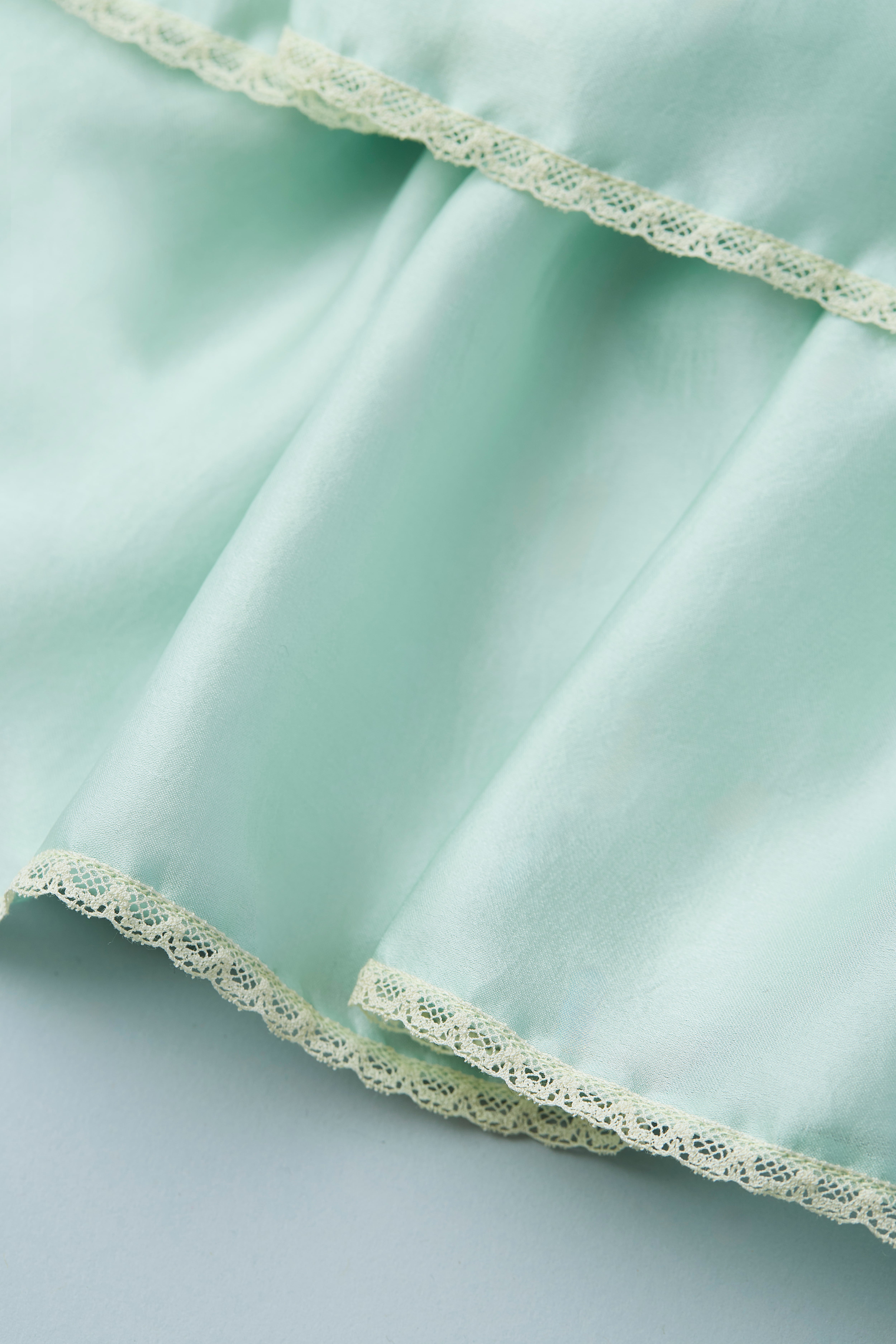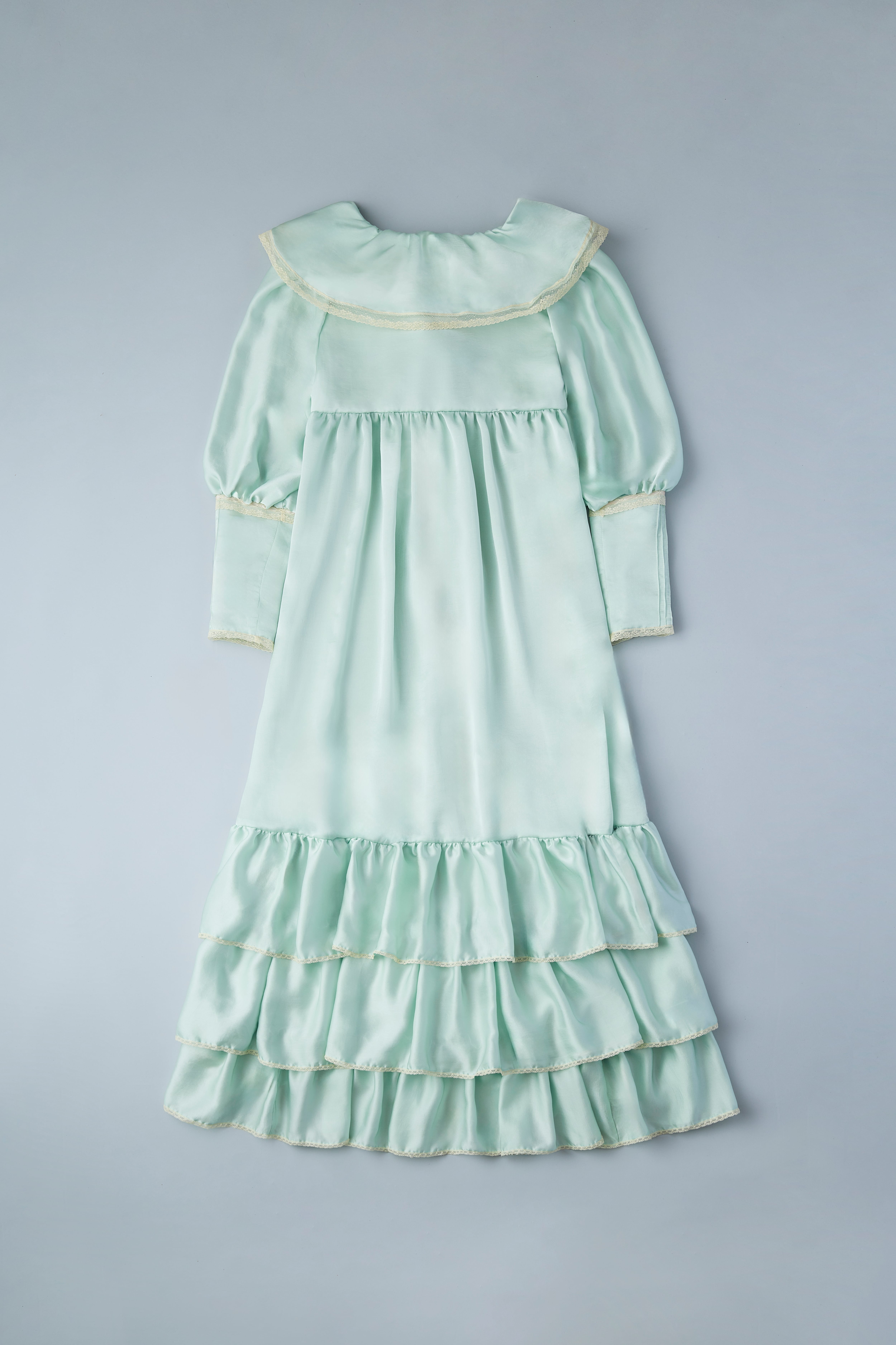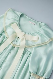 アンティークのナイトドレスにあるような大きめの襟、ピンタックの入った袖、フロントのリボンと裾のフリルが特徴のナイトドレス。