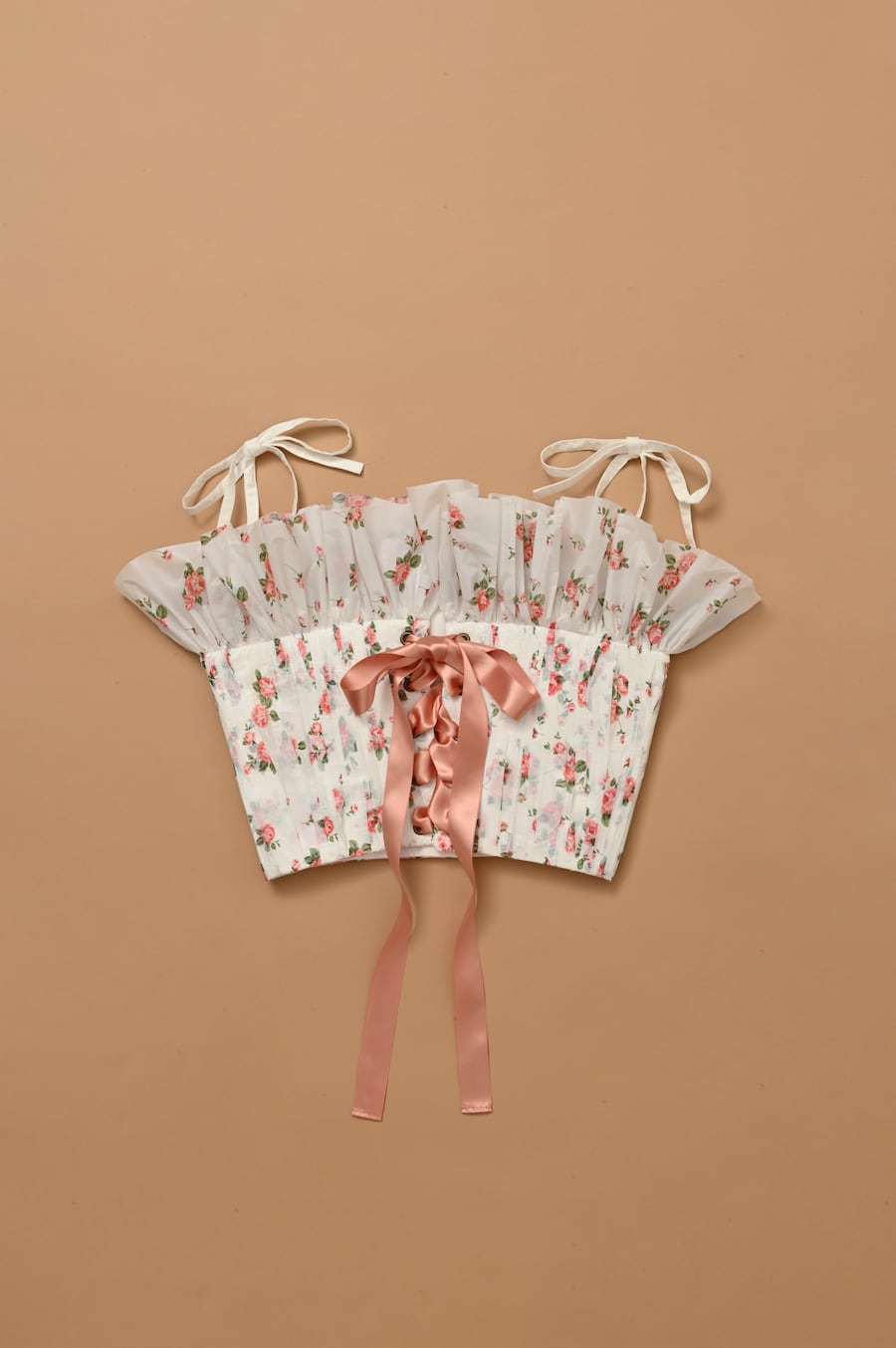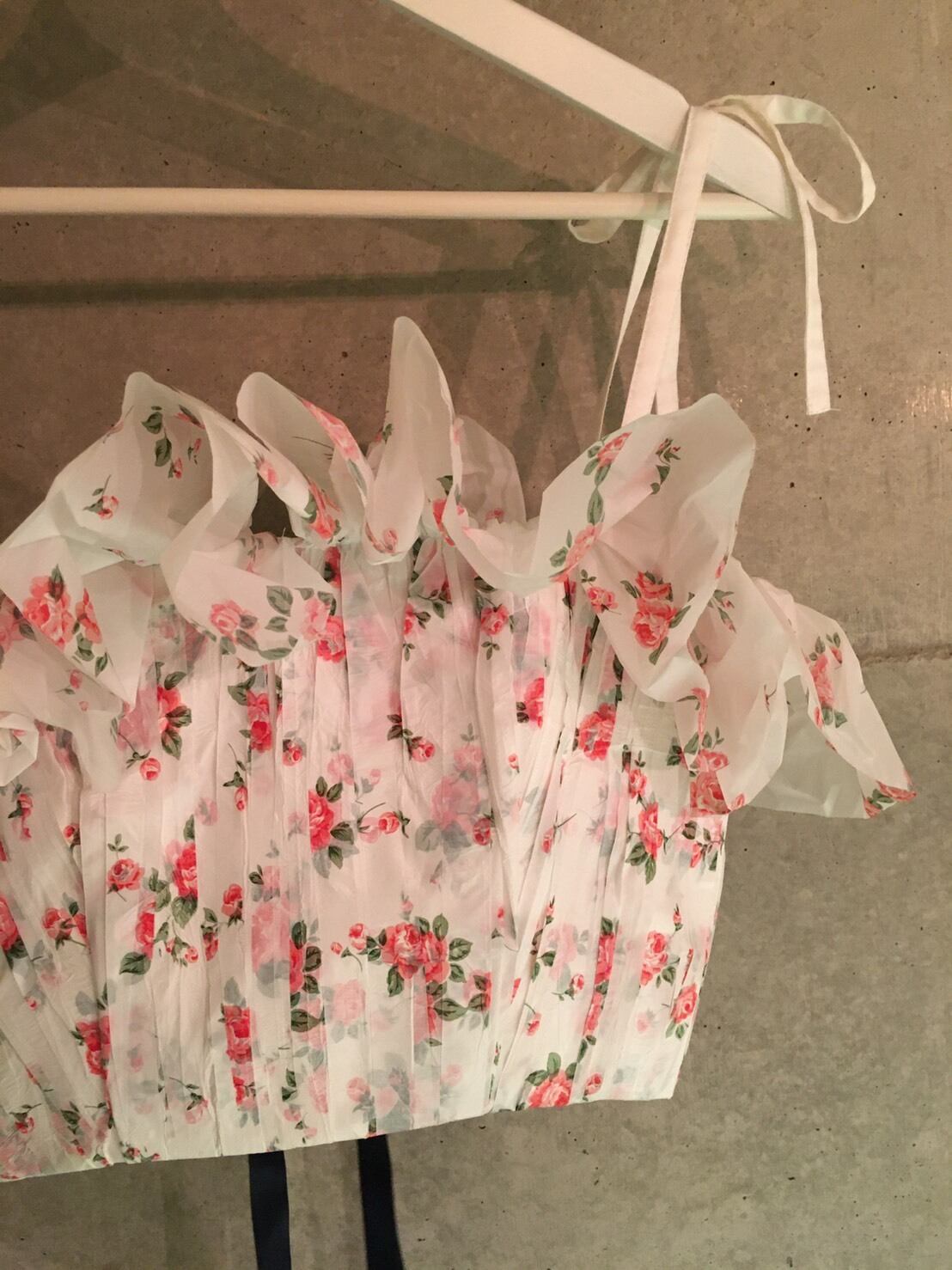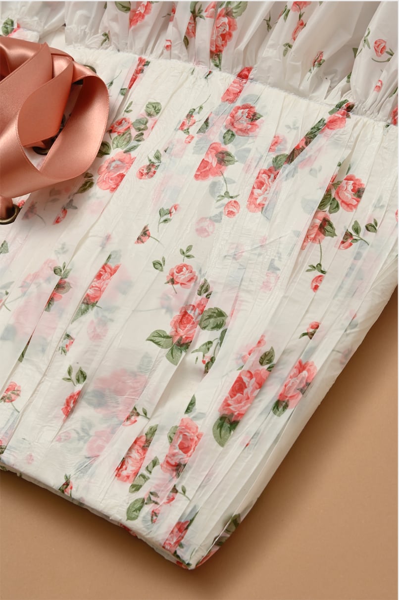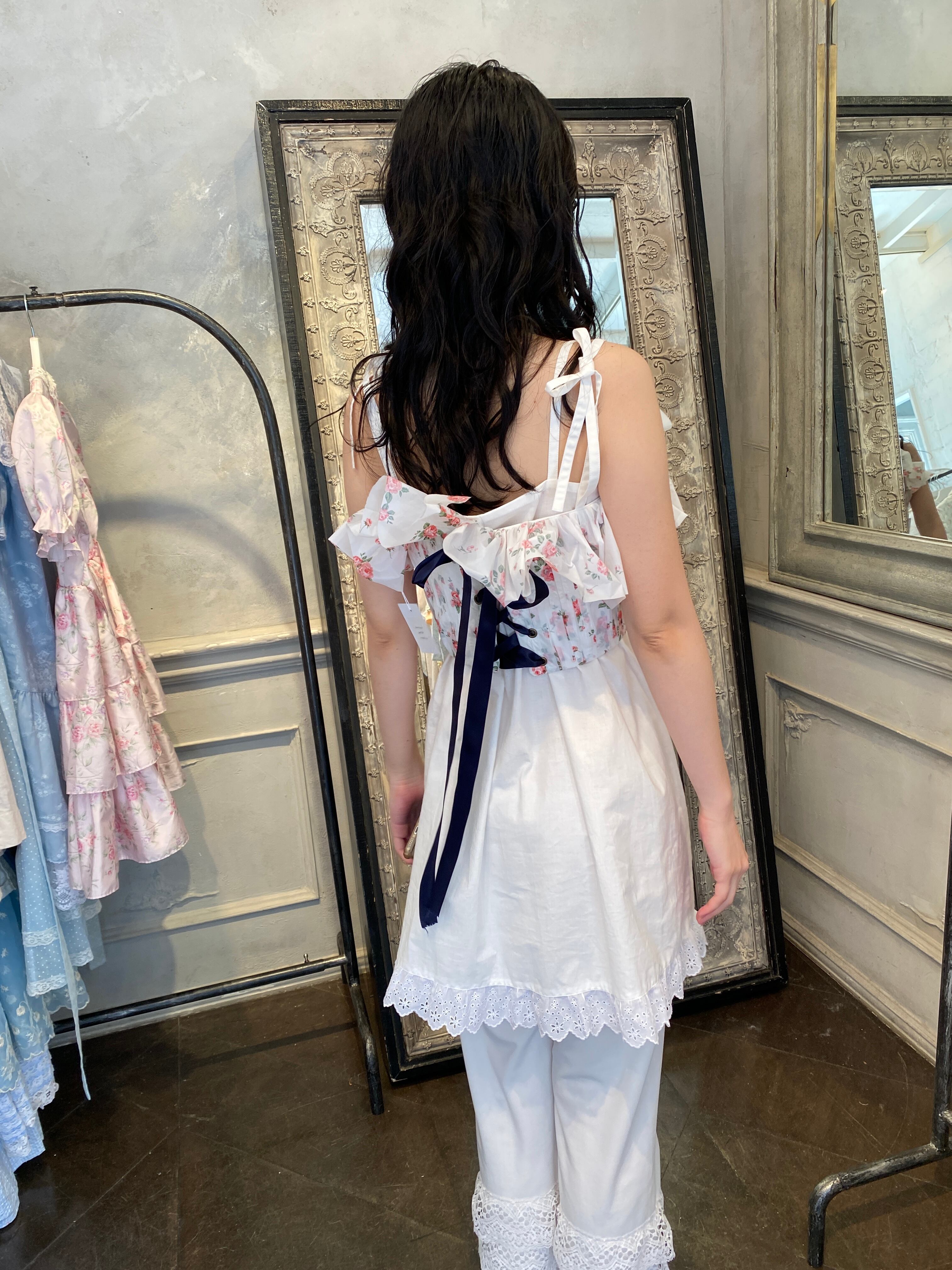 natsumi osawaのシグネチャーであるフローラルプリントのテーブルクロスをコルセットトップに。