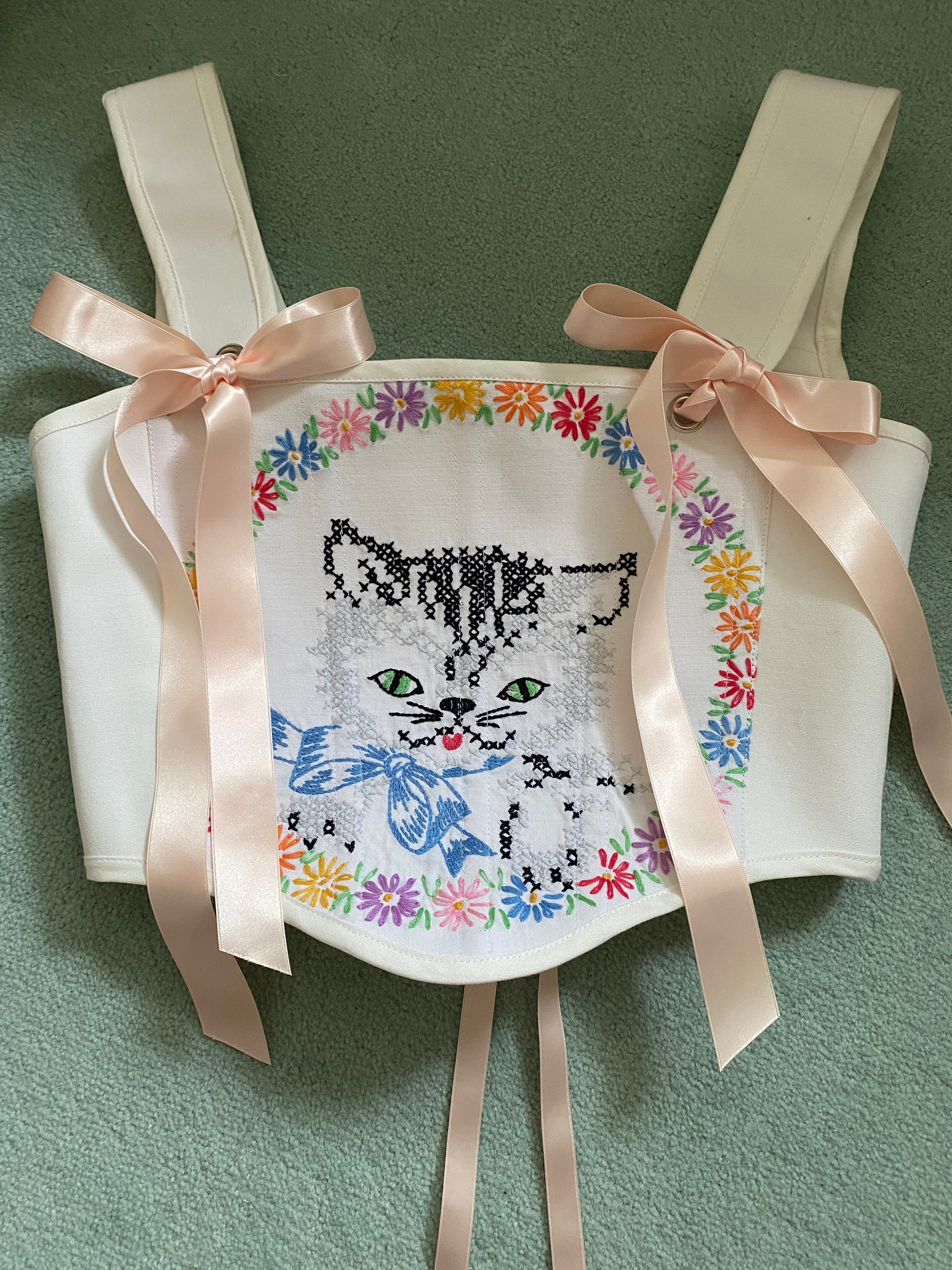 こちらはネコが刺繍されたヴィンテージのテーブルクロスからアップサイクルしています。