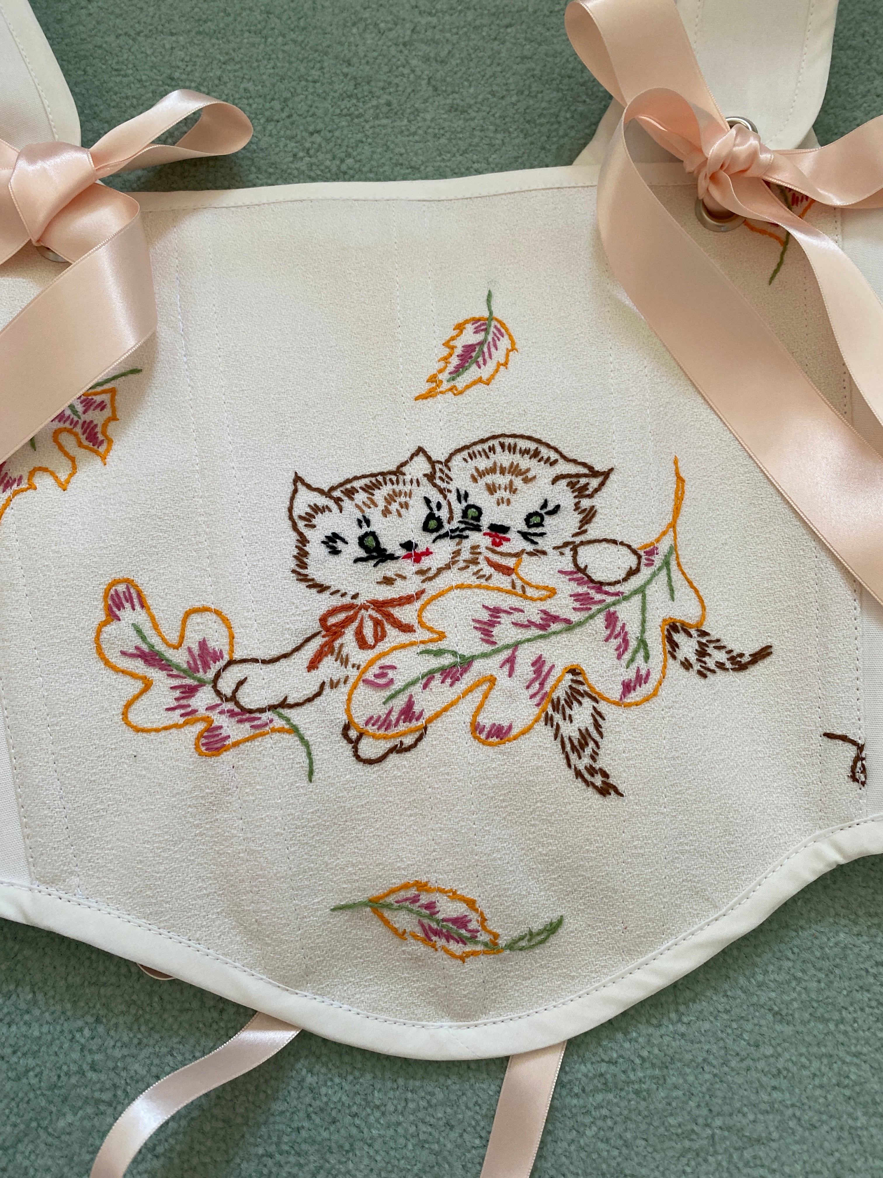 こちらはヴィンテージのネコの刺繍が可愛いテーブルクロスからアップサイクルしています。