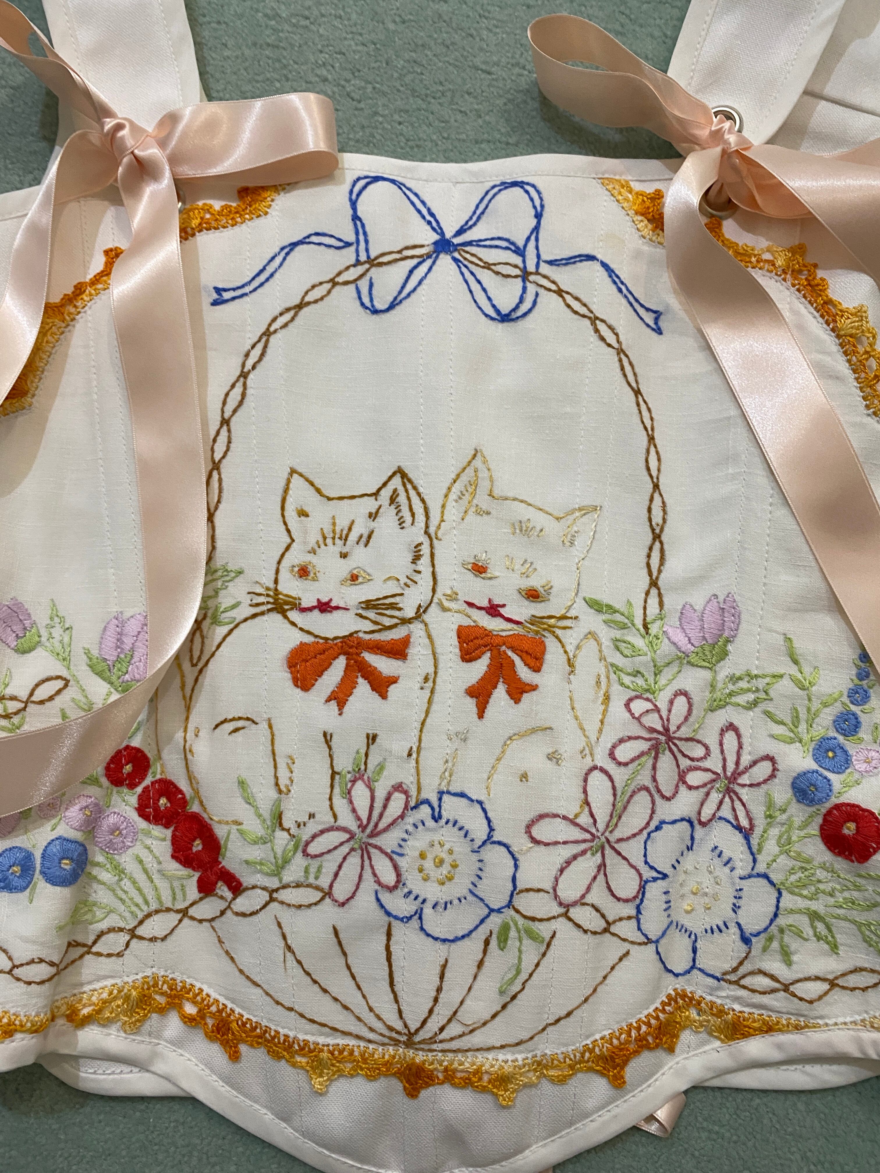こちらはヴィンテージのネコやリボンの刺繍が施された生地を使用した1点もののかなりスペシャルな1着になります。
